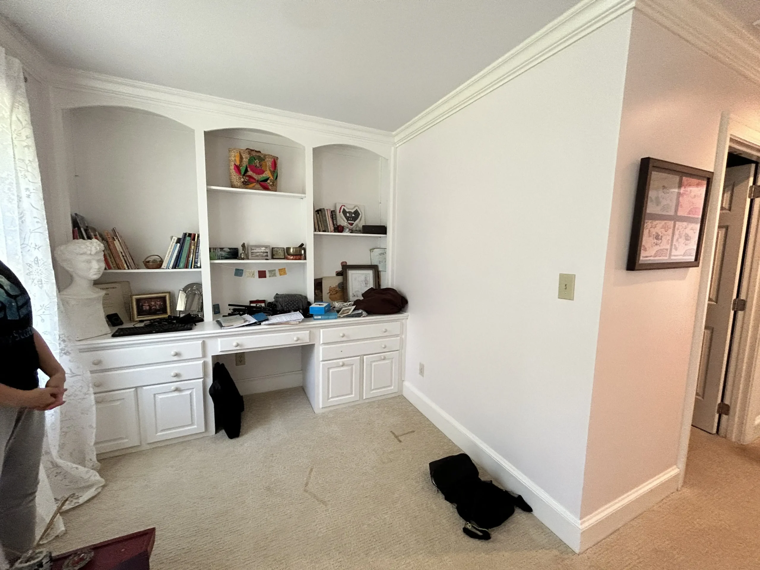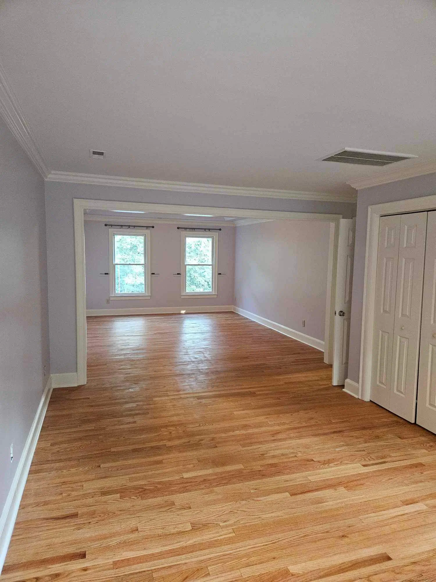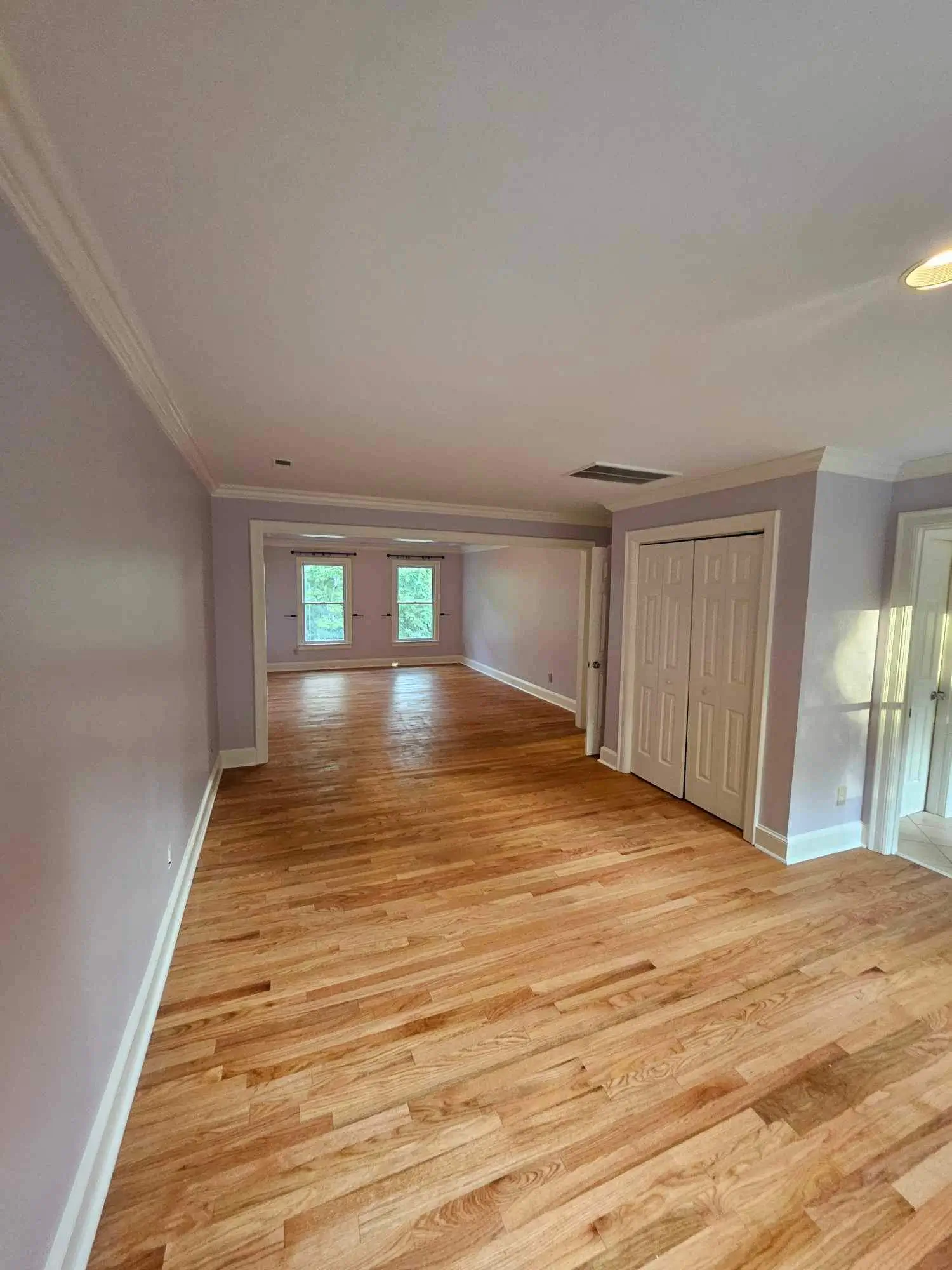 In this bedroom and sitting area renovation, we transformed an outdated space into a modern, cohesive retreat. The project involved removing an old closet and built-in cabinetry, pulling up worn carpet, and installing new hardwood flooring that seamlessly matches the hallway. Our team sanded and professionally stained the floors for a flawless finish, hung new drywall, completed all finishing touches, and applied fresh interior paint, creating a stylish, functional, and refreshed living space.